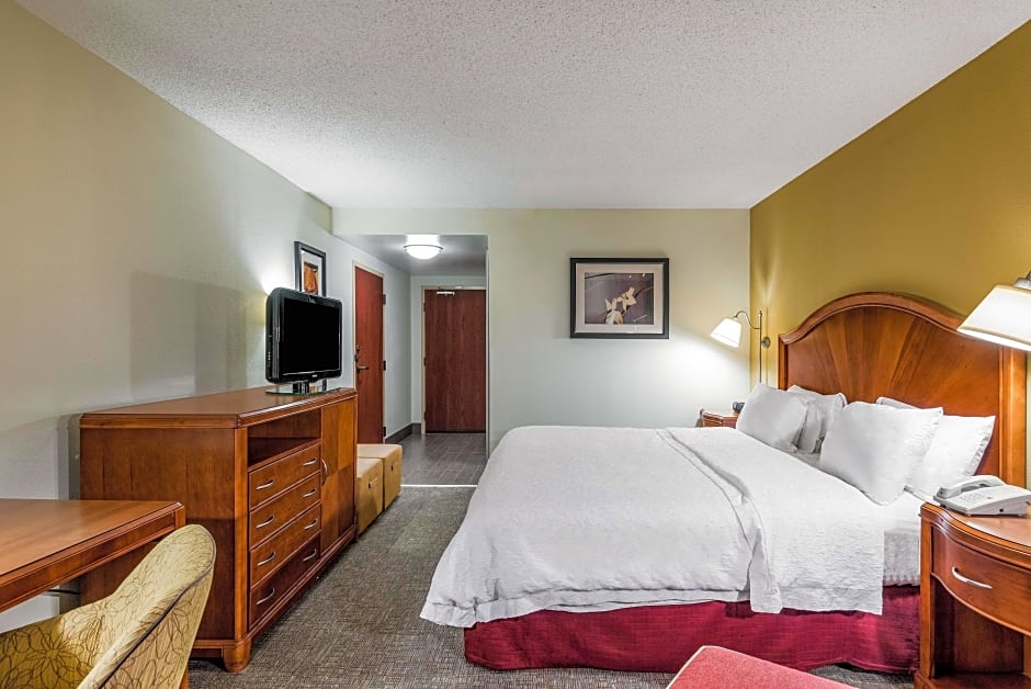Free WiFi access, whirlpool tub, HDTV, easy chair & ottoman, work desk, coffeemaker Enjoy your stay in this spacious non-smoking room which features one king-sized clean and fresh Hampton bed® and a relaxing whirlpool tub. Unwind in the easy chair with ottoman and watch a movie on the 25-inch HDTV or work at the desk and stay connected with free WiFi access. Savor a freshly brewed coffee from the coffeemaker provided. The bathroom offers plush towels and a shower with a Waterpik® showerhead and curved shower rod which allows more light and space in the shower.